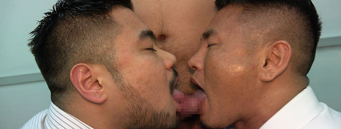 されるがままにスーツを弄られ、先輩達のチンポが交互に襲いかかる!大和は2本のチンポを同時にしゃぶり奉仕する。男2人に責められて興奮し大和もチンポをおっ勃てる。先輩達に乳首もチンポも舐め回されよがり始める大和。オフィスのデスクでケツ穴ほぐされ生チンポでノンケが犯される!「アナルもチンコも気持ちいいです…」休む間もなく先輩達もどんどんヒートアップして掘り倒し入り乱れ、社内に喘ぎ声が響き渡る…大和は掘られながら射精して潮噴きも浴びる!ノンケのアナルで先輩達も射精し、発情を満たし退散して行った…